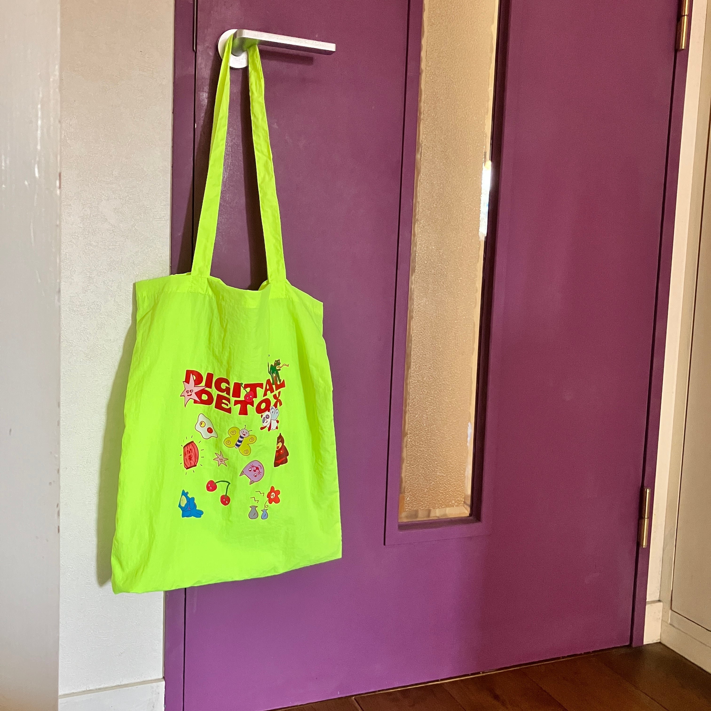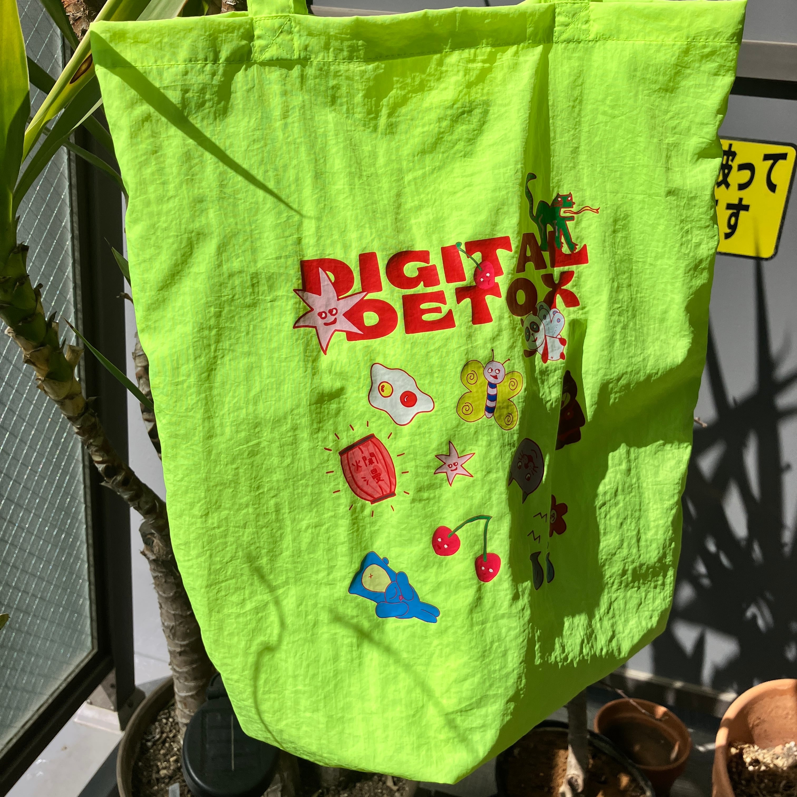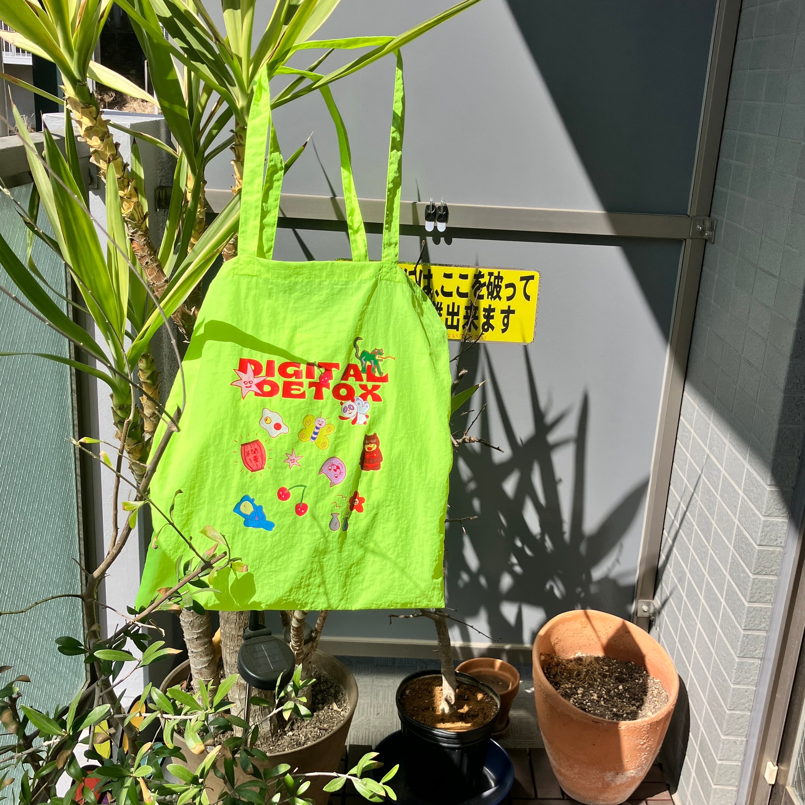 DIGITAL DETOXの活動の始まりはお気に入りのトートバックに少しずつ刺繍をすることでした。焦らず時間をかけて気に入ったモチーフを思いついたタイミングで増やしていったのでズタボロになった今でも愛おしくって大切な宝物です。今回はそんな愛するズタボロデコトートをイメージしたグッズを製作しました。